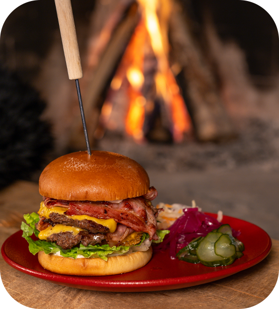 A large natural stone fireplace, log walls, and a warm, inviting interior create a genuine slope-side restaurant setting where it’s easy to relax any day of the year.